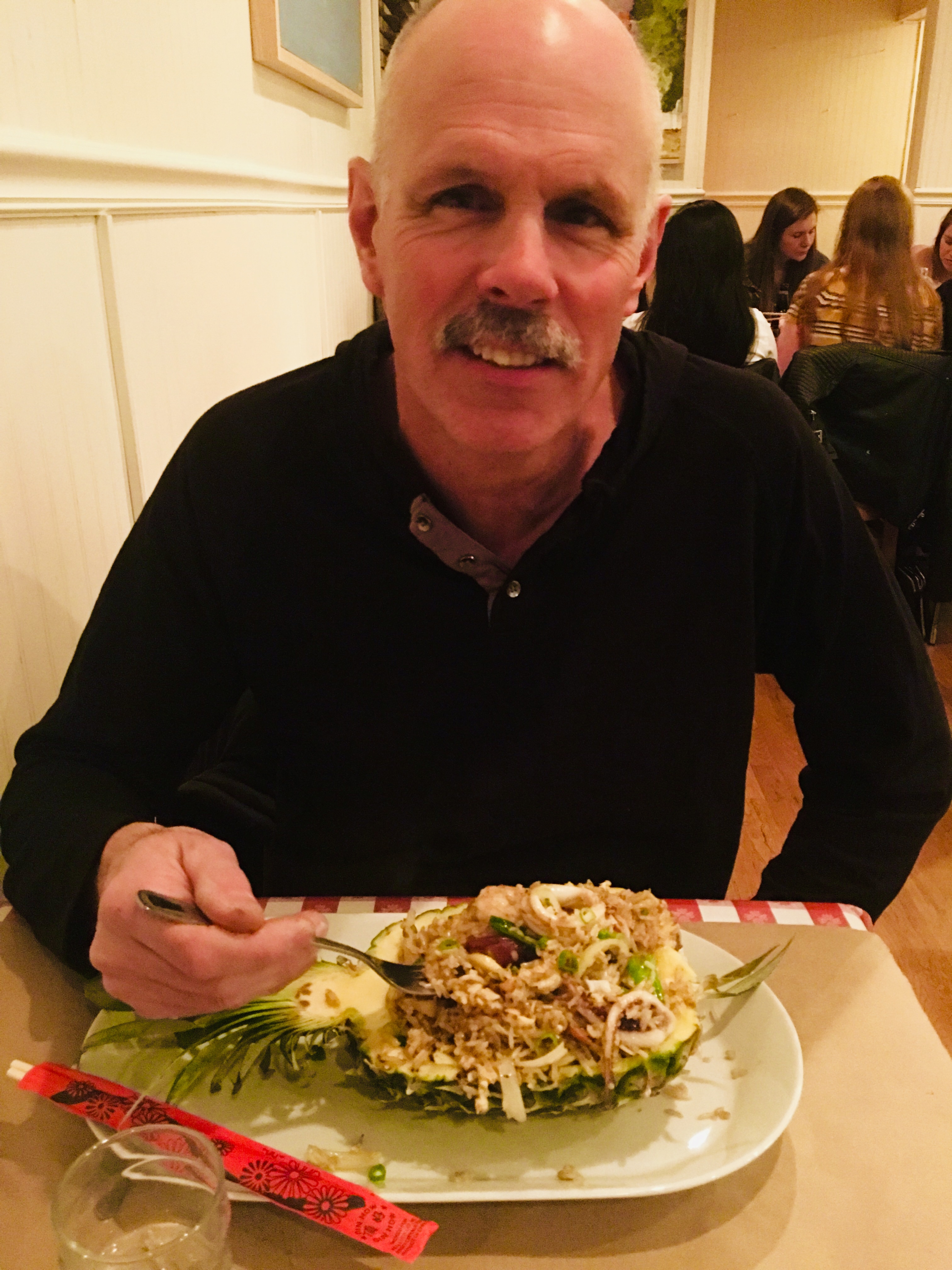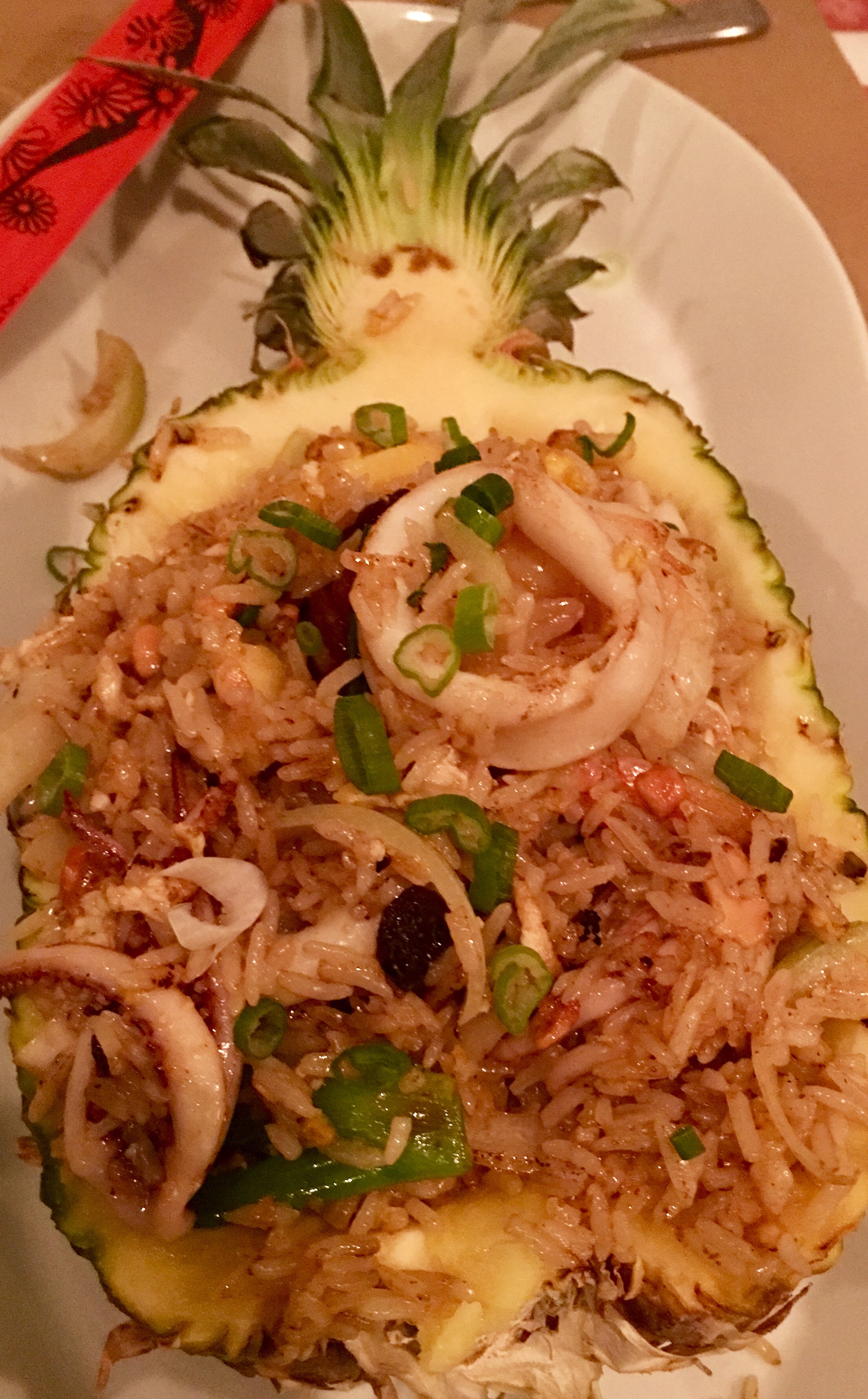 When our meals came we had an element of surprise when they served Mike’s entrée in one half of a pineapple. Apparently we overlooked that it said “in pineapple.” Mike loved the flavor of the rice, seafood, fruit and nuts combination. He was very pleased with his choice and ate every bite.