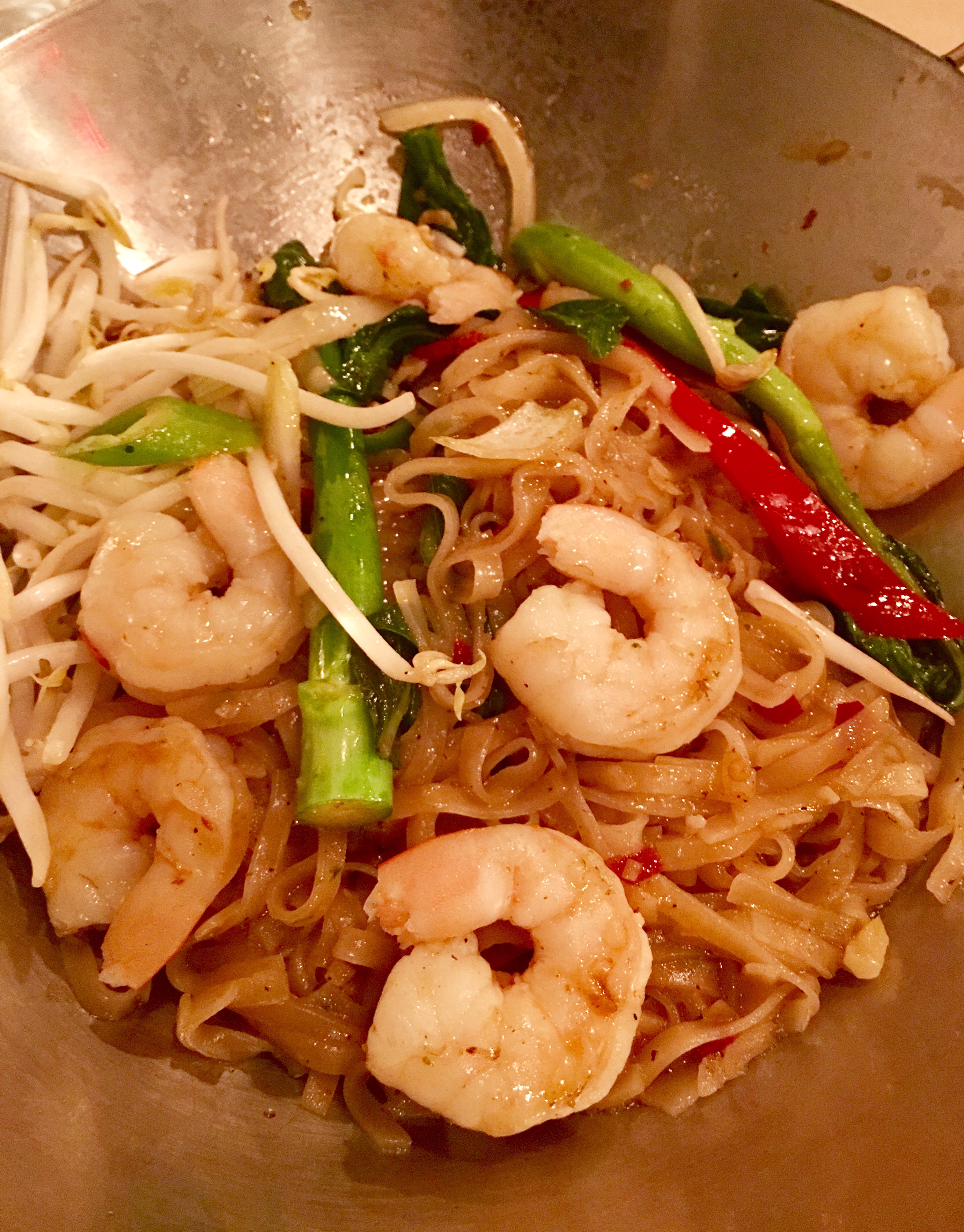 It’s no surprise “Drunken Noodles” is their most popular dish! The fresh rice sticks (flat rice noodles that look like thin linguine) were cooked to perfection and accompanied by several shrimp, peppers, Chinese broccoli, sprouts and a delicate, flavorful sauce with just enough spice to leave your taste buds longing for another bite! It was served piping hot (one of the advantages of made to order dishes) in a metal wok style bowl and, of course, chop sticks. Since I’m Italian and a pro at twirling pasta and have yet to master chop sticks, I ate my meal with a fork. I’m pretty certain we were the only ones using utensils!
